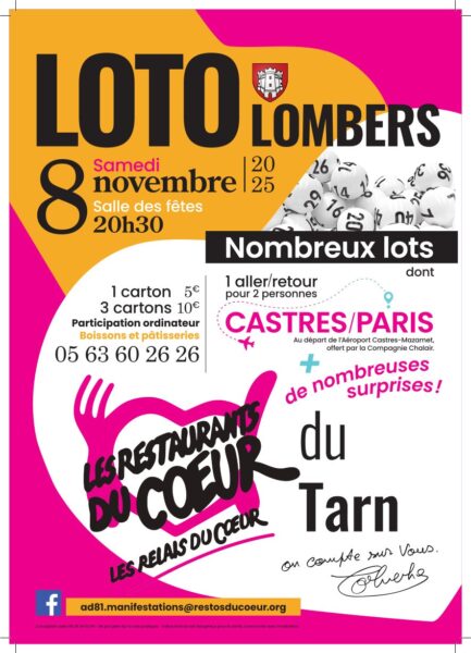 Les restos du cœur du Tarn organisent leur traditionnel loto solidaire .Si vous souhaitez participer à une soirée conviviale et contribuer à lutter contre la précarité alimentaire mais aussi à l’aide à la personne, venez nous rejoindre dans la salle des fêtes de Lombers.